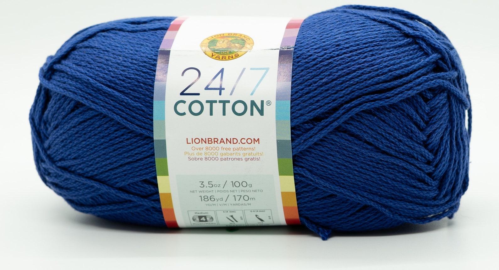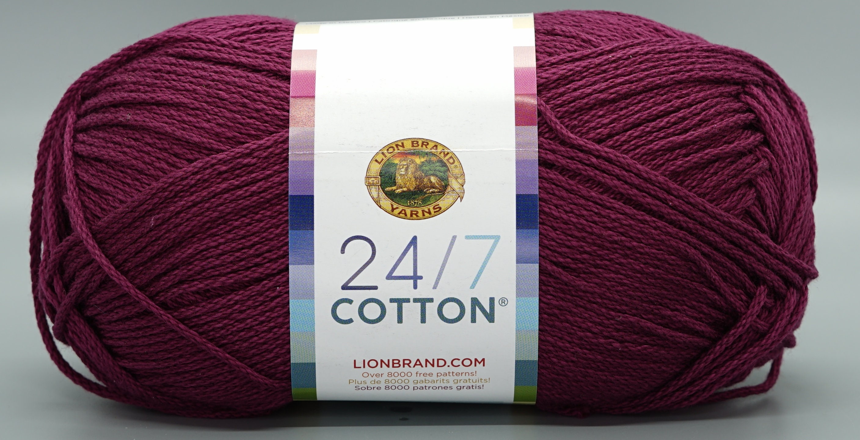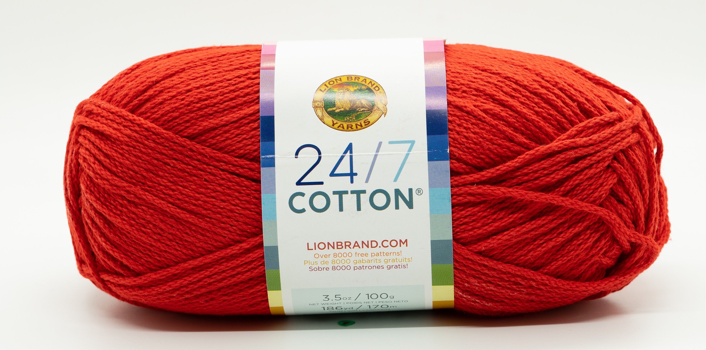 Lion Brand 24/7 Cotton 100% Cotton, 186yds (170m)/100g (3.5oz), Worsted. By Lion Brand. 23 reviews $4.99 27 Shades. View:. The 24/7 Cotton is an dream come true. This 100% mercerized cotton is great for clothes, accessories, home textiles, things for the baby, toys for the kids, and pets. The sheen is really striking, and the palette?