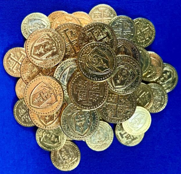 Each coin set includes 24 coins, 10 copper, 8 silver and 6 gold. The exception to this rule are the Unit and Medieval Unit sets, which do have denominations on them and consist of 30 coins, with 19 copper, 8 silver and 3 gold. Enjoy the selection of our 29 different metal coin sets below. SHOP find coins for your games.