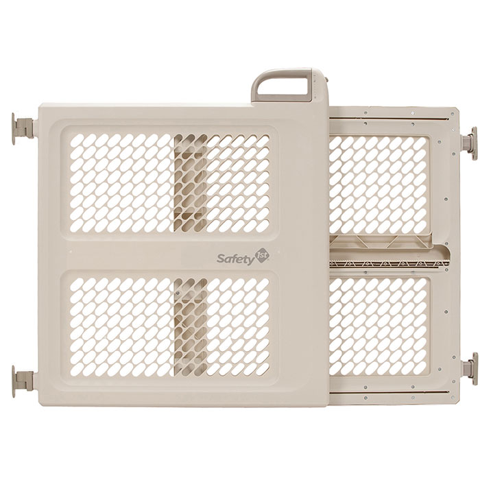 Easy to open with one hand by parents but difficult for tots, this sturdy metal child gate from Safety 1st adjusts to fit doorways and openings ranging from 29 to 38 inches wide. Pressure-mounted installation requires no tools, drilling, or hardware and allows for setting up this gate quickly and easily in doors or pass-through areas.